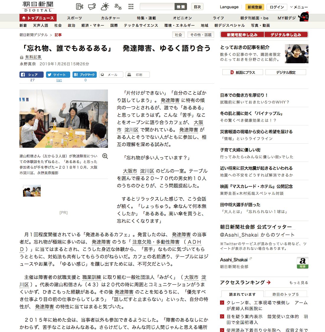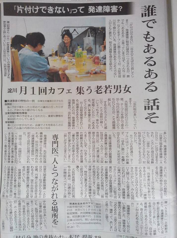 1/23(水)朝日新聞夕刊(関西版)、1/26(土)朝日新聞デジタルにて発達あるあるカフェの取り組みを掲載していただきました。